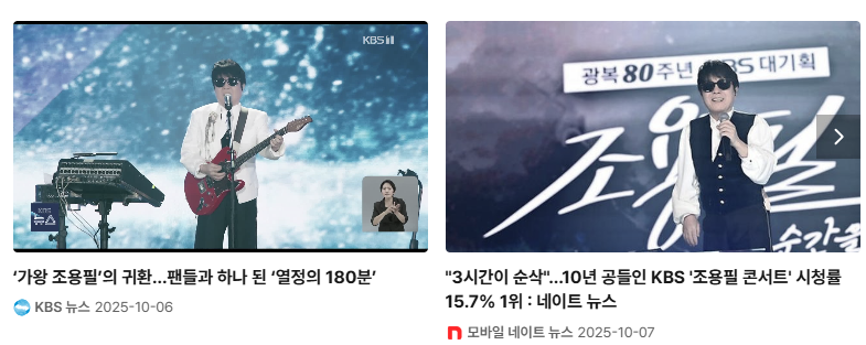 KBS는 광복 80주년을 기념하여 가수 조용필의 단독 무료 콘서트 '이 순간을 영원히'를 개최했습니다. 이 공연은 조용필이 1997년 KBS '빅쇼' 이후 28년 만에 KBS에서 선보이는 단독 무대라는 점에서 큰 의미를 지닙니다. 또한, 데뷔 57주년을 맞은 조용필의 특별한 공연으로, 1만 8천여 명의 관객을 운집시키며 뜨거운 호응을 얻었습니다. 이모저모 정리합니다.