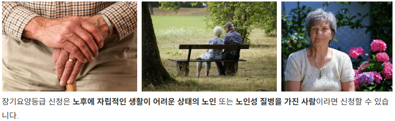 - 대상자: 65세 이상 또는 치매·중풍·파킨슨병 등 노인성 질병이 있는 65세 미만