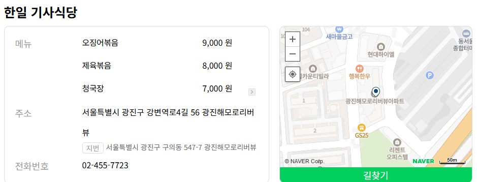 특징: 50년 전통의 국수집. 멸치국수, 잔치국수 모두 5,500원으로 가성비 최고. 소화도 잘 되는 메뉴 구성.
