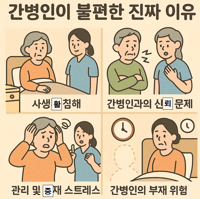 가정에서 간병인을 고용하는 것도 만만치 않습니다. 간병인 1일 평균 비용은 12~20만 원 수준이고, 장기 간병 시 월 300만 원이 훌쩍 넘어갑니다. 비용 외에도 다음과 같은 불편함이 동반됩니다.