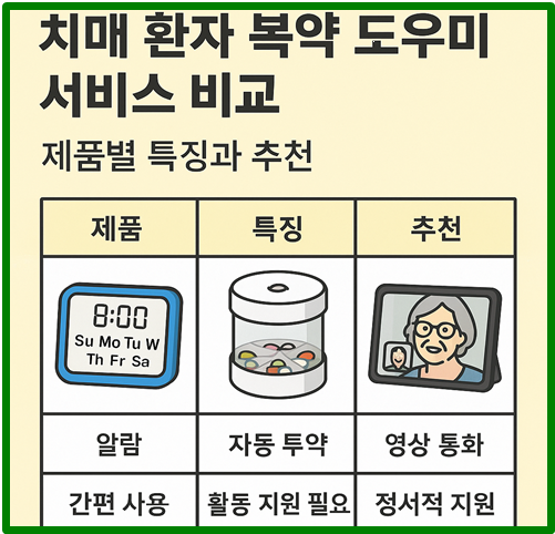 치매 환자 복약 도우미 서비스의 장단점을 꼼꼼히 비교해보세요.전문가 관점에서 주요 제품의 특장점과 선택 기준을 알려드립니다.