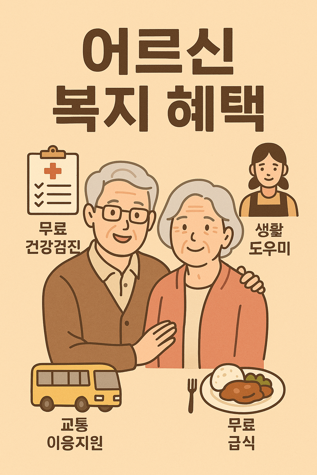 - 건강검진: 만 66세 이상 2년마다 무료 (기초 건강검사 + 치매 검사 포함)