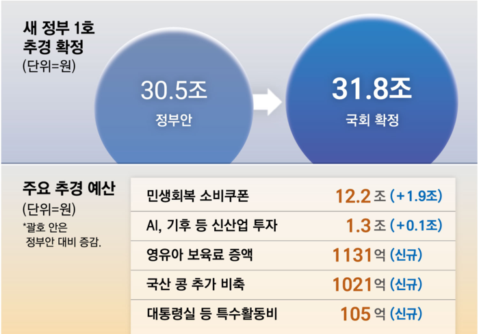 이재명 정부는 7월 4일 국회를 통과한 ‘제2회 추가경정예산안(추경)’을 통해 31조8000억원 예산을 확정했습니다. 이 중 소비쿠폰 사업에 정부·지자체 매칭 예산을 포함해 약 12조1700억원이 투입됩니다