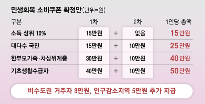 31.8조 규모 추경 통과로 이달 말부터 전국민에게 15만~55만원 소비쿠폰 지급! 비수도권은 3만원, 소멸위기 농어촌 5만원 추가…혜택 대상·방식 완벽 정리.