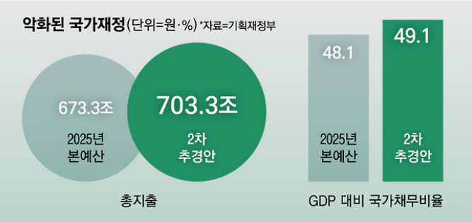 - 국채 발행으로 1조3000억원 증액되며, 국가채무 비율은 **GDP 대비 49.1%**로 상승