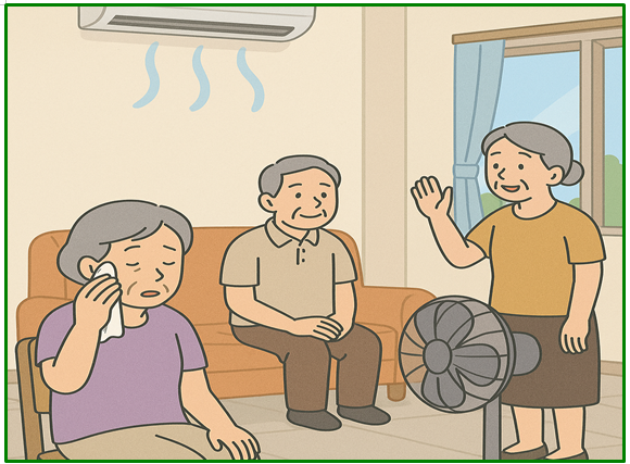 | ☑ 냉방 시 체온 유지 | 에어컨 바람이 직접 닿지 않도록 겉옷 챙기기 | 냉방병, 혈압 급변을 막기 위해 실내 온도는 26 |