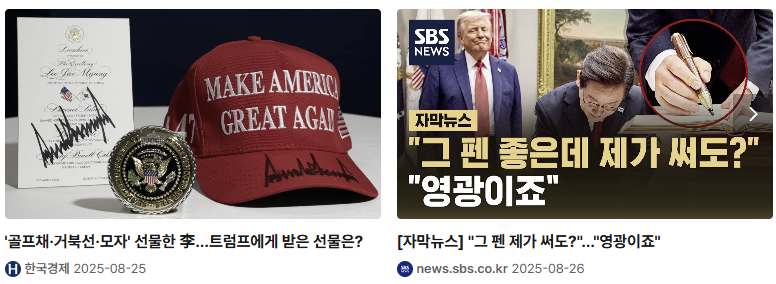 트럼프 전 대통령은 방명록 서명 당시 사용한 펜에 큰 관심을 보였다고 합니다. 이에 대통령실은 트럼프에게 그 펜 역시 선물로 전달했다고 밝혔습니다. 이는 상대의 ‘관심 포인트’를 놓치지 않는 디테일한 외교 기술로, 기억에 남을 선물을 통해 신뢰를 강화하는 전략으로 풀이됩니다.